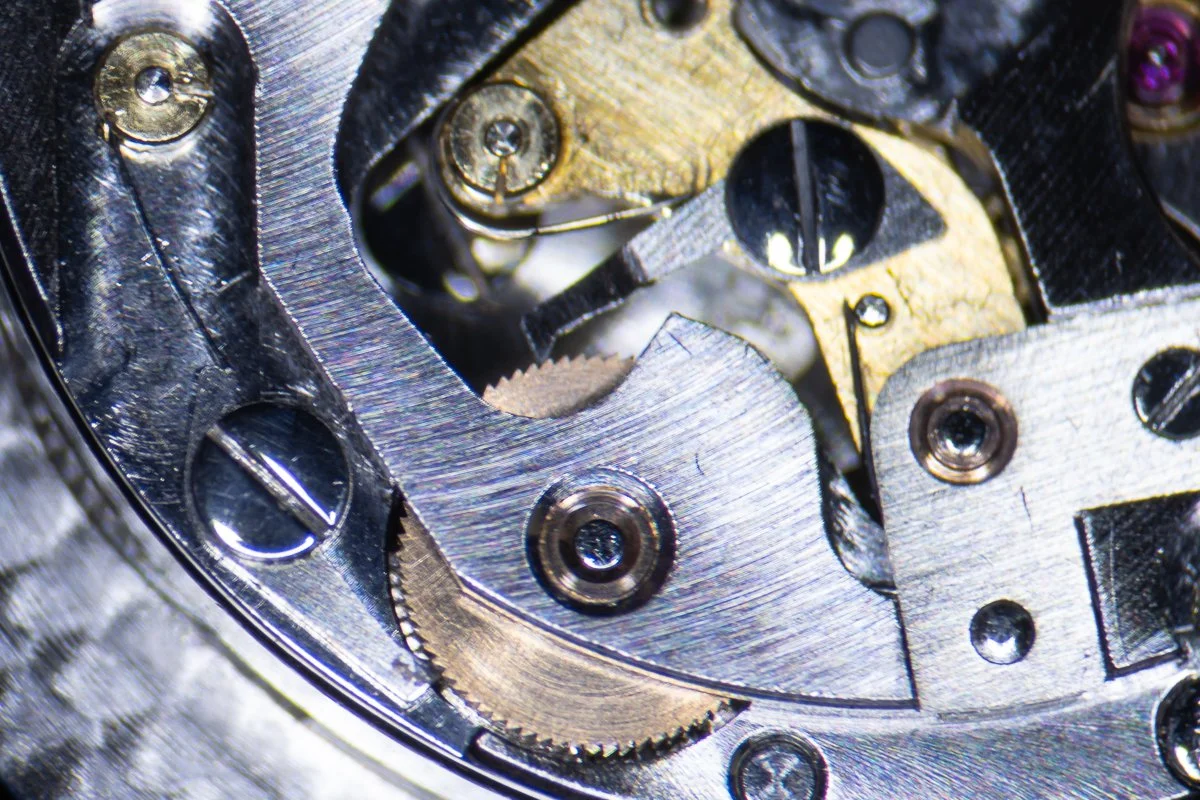 Note the jeweled pivot just to the right of the ratchet wheel, which will accept the pinion that transfers torque from the automatic mechanism. This is the 16th jewel in the movement.
