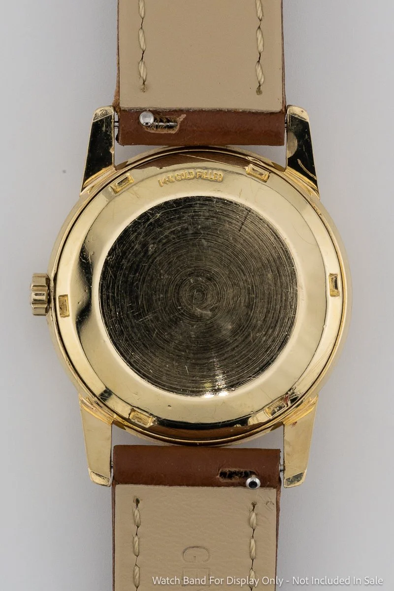 The 14K gold-filled case houses a stunning two-tone, dual-texture dial featuring a contrasting outer ring that defines its vintage character. Measuring at a classic 31mm, this timepiece offers a refined presence perfectly suited for a smaller wrist, showcasing the mid-century preference for understated and comfortable proportions without sacrificing visual impact.